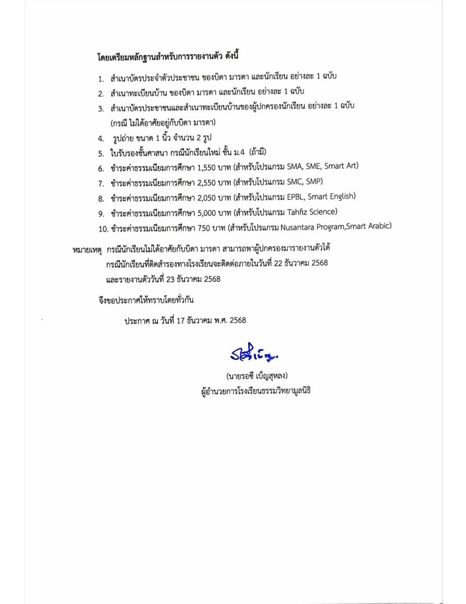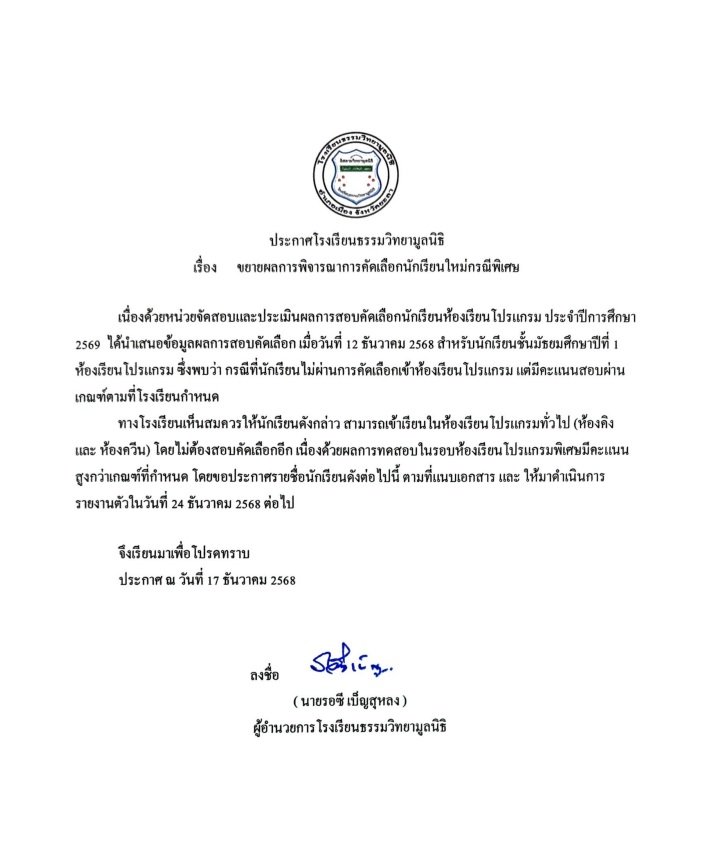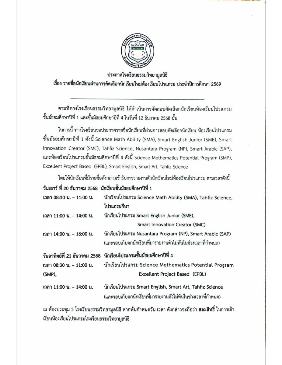 รายชื่อนักเรียนที่มีสิทธิ์ยืนยันตนเข้าศึกษาต่อในระดับชั้นมัธยมศึกษาปีที่ 1 ในรอบทั่วไป โดยไม่ต้องสอบคัดเลือก เนื่องจากมีผลคะแนนสอบในรอบห้องเรียนโปรแกรมผ่านเกณฑ์ ที่โรงเรียนกำหนด [ดูรายชื่อ]